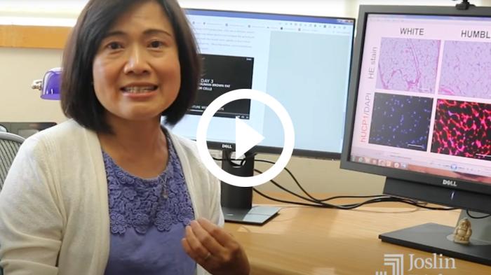 Yu-Hua Tseng, PhD, a Senior Investigator in Joslin’s Section on Integrative Physiology and Metabolism discusses recent findings on brown fat research. This research finds a potential therapy for obesity using transplanted HUMBLE (human brown-like) fat cells - human white fat cells that have been genetically modified using CRISPR to become similar to heat-generating brown fat cells. CREDIT: Joslin Diabetes Center.