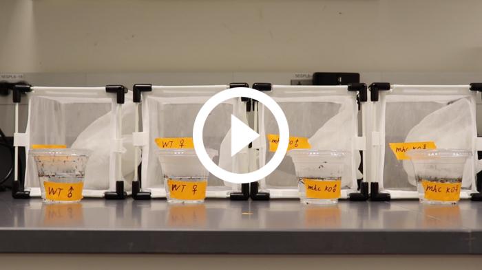 Video description: Timelapse of myo-fem mutant flight. Cages consisting of myo-fem mutant ♀’s, myo-fem mutant ♂’s, WT ♀’s, and WT ♂’s were recorded over 5.5 minutes. The cages were occasionally tapped to stimulate movement. The myo-fem phenotype is visible from 2.20 minutes onwards. Symbols:♀= female, ♂= male.