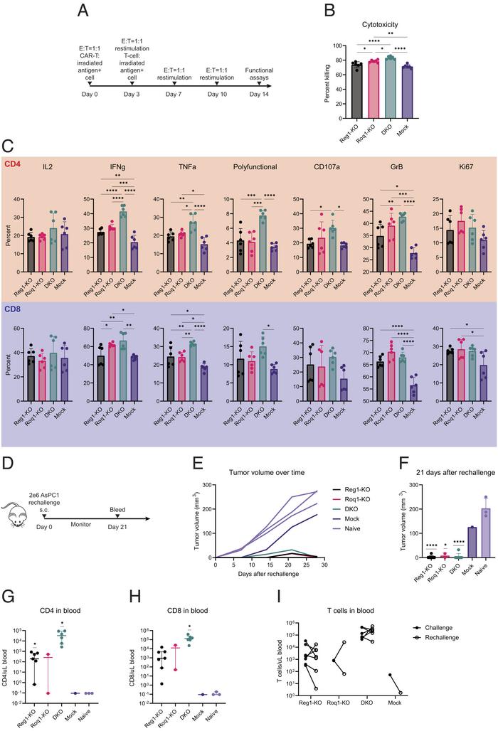 Figure 1: Regnase-1 and Roquin-1 double knockout enhances functional persistence. (A) In vitro restimulation assay to assess functional persistence. (B) Cytotoxicity of serially restimulated CAR-T cells at various E:T ratios. (C) Cytokine expression of serially restimulated CD4 (Top) and CD8 (Bottom) T cells. (D) In vivo mouse experiments to evaluate persistence of knockout CAR-T cells and response to tumour rechallenge. (E,F) Reponses to tumour rechallenge by knockout and mock CAR-T cells following at least a month from primary tumour clearance. (E) Tumour growth over time after rechallenging previously treated mice. (F) Tumour sizes 21 d after rechallenge. (G,H) Quantification of CD4 (Left) and CD8 (Right) T cells in peripheral blood 21 d following tumour rechallenge. (I) Changes in peripheral T cell numbers between 21 d after initial tumour challenge and 21 d after tumour rechallenge in rechallenged tumour-cleared mice. Mai et al. PNAS (2023) doi.org/10.1073/pnas.2218632120