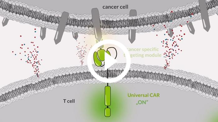 Here's how it works: donor-derived T cells are transduced to express a biologically-inert universal CAR against tumour antigens. A TM, which is infused separately to the CAR-T cells, comprises a flexible antigen-binding moiety, which is linked to a motif recognised by the universal CAR. Thus, the TM provides antigen specificity to the CAR-T cells, redirecting and activating them to act on the target, which in this case is CD123. The presence or absence of the TM in circulation elegantly allows “on” and “off” control, respectively, of the therapeutic activity.