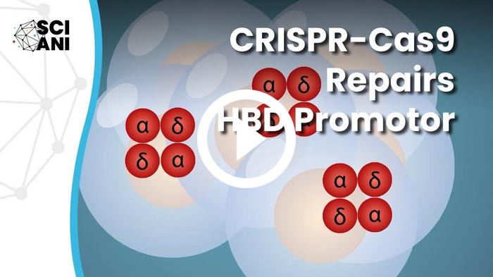 Video description: Using CRISPR-Cas9 to repair the HBD promoter leads to increased production of hemoglobin HbA2. This video illustrates the promoter-editing strategy developed by researchers in the Corn Lab at ETHZ (https://www.cornlab.com). The team used CRISPR-Cas9 to edit transcriptional elements in the HBD promoter, which upregulates the expression of adult haemoglobin A2. The researchers are now exploring this approach as a new way to treat β-hemoglobinopathies.